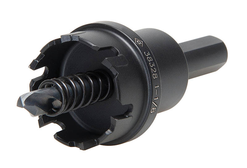 The efficient Greenlee CUTTER, HOLE-CARBD (1.125",28.6MM) is a 1-1/8" carbide-Tipped Hole Cutter in, 1-3/8-Inch has a flange stop that prevents over-drilling, a multiple tungsten carbide tips for long life and smooth cutting. It also has a replaceable cobalt steel pilot drill, with a split-point tip design, to improve performance and resist walking that eliminates the need for a center punch.