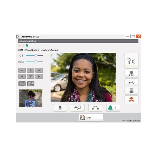 The efficient Aiphone IX-SOFT PC Master Station Software is a software master station for the IX Series. Use IX-SOFT to call and communicate with IX Series stations across a network. Software master station features include monitoring, paging, and door release. Check device functionality and network status of each station using the Line Supervision menu. Use the interactive map to quickly interact with door and master stations by selecting them individually or by dragging to select a group.
