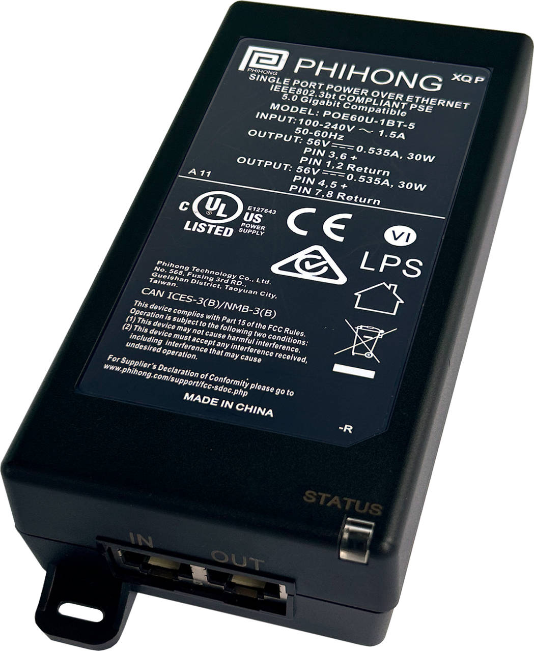 The efficient Bogen PI5660W IEEE 802.3bt 56V 60W Power over Ethernet (PoE) 1-Port Midspan Injector provides regulated 56VDC and 60W at 1.07A from a 100–240VAC, 47–63 Hz source.