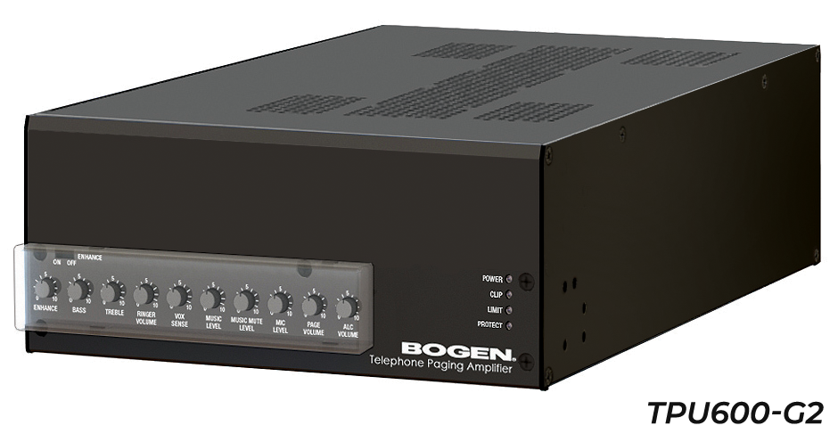 The efficient Bogen TPU600-G2 Telephone Paging Amplifier (600W) is a full-featured wall- or rack-mounted telephone paging amplifier that provides inputs for a dry-loop, 600-ohm telephone page signal, a background music source, and a low-impedance microphone. Automatic background music mute is provided when making a telephone call. The background music mute level during a page is adjustable, and the music then gradually fades back in after the page is completed.