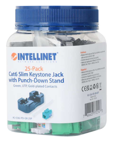 The well-made Intellinet 772143 Cat6 Slim Keystone Jack with Punch-Down Stand, Green, 25-Pack, IKJ-C6U-PD-GR-25P for Easy Fit in High-density Patch Panels, UTP, for Solid Wire, Gold-plated Contacts.